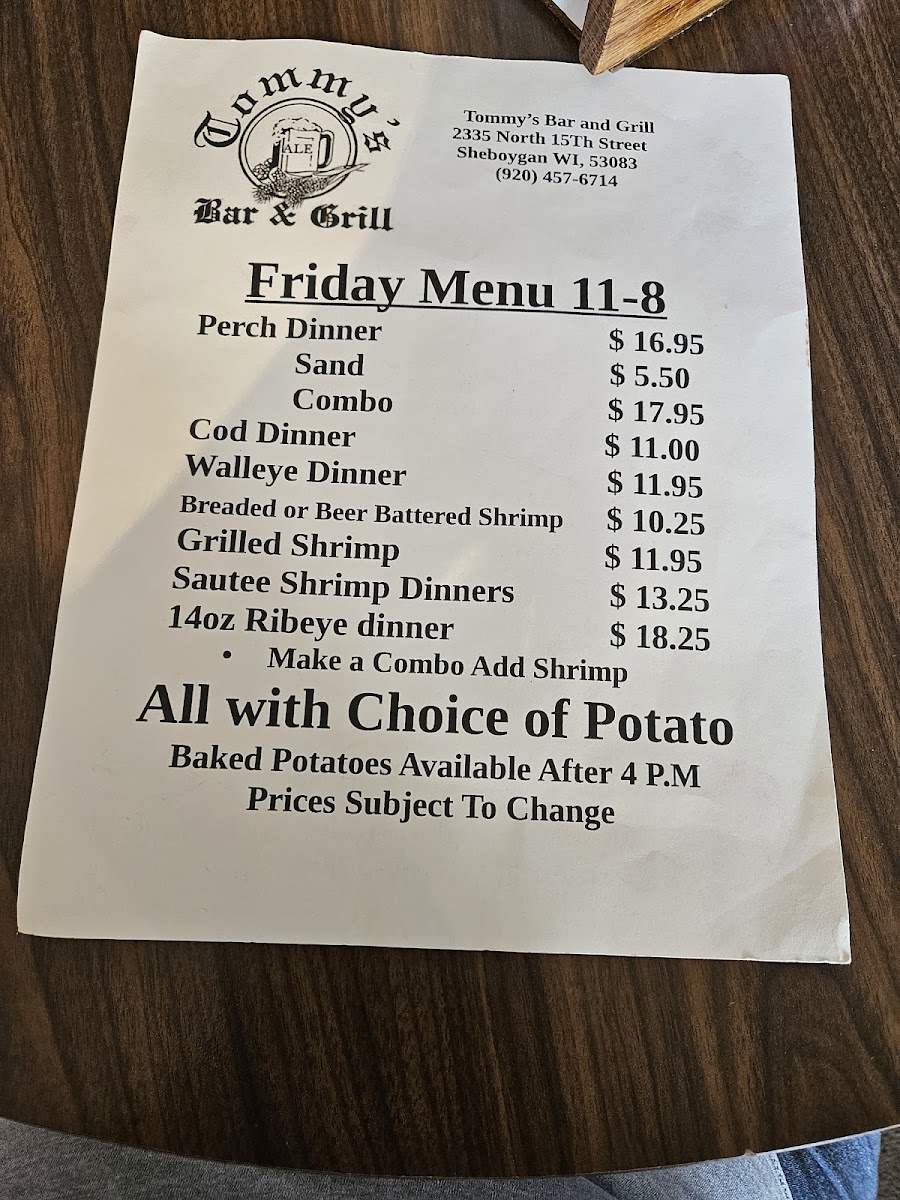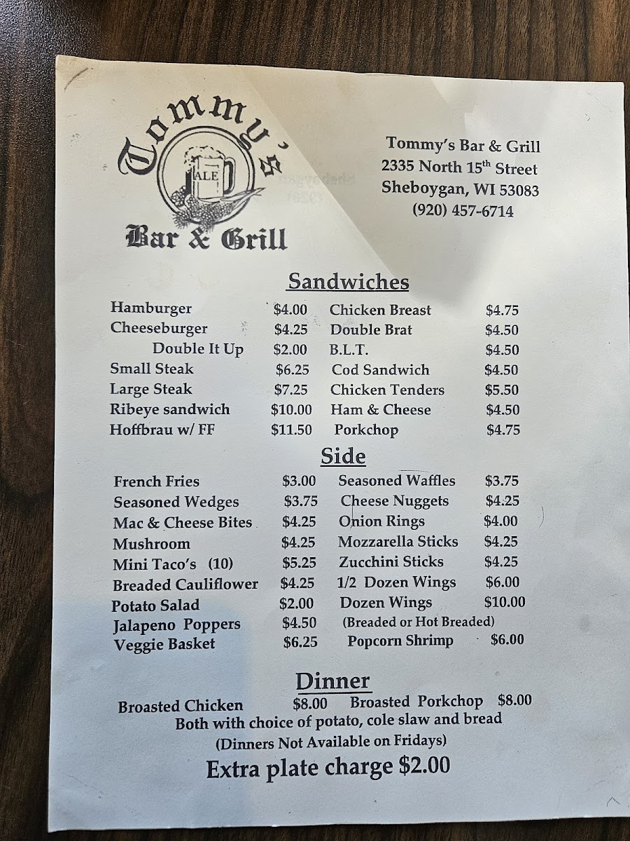 Tommy's Bar Menu